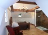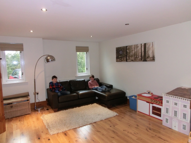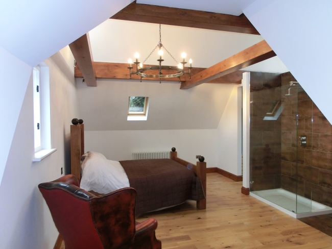 The new extension provides a family room on the ground floor, accessed down two steps from the existing living room. A single garage is formed at the far end of this extension. A new master bedroom with en-suite and built-in wardrobes has been created on the upper floor with open-vaulted ceiling and low level eaves.
