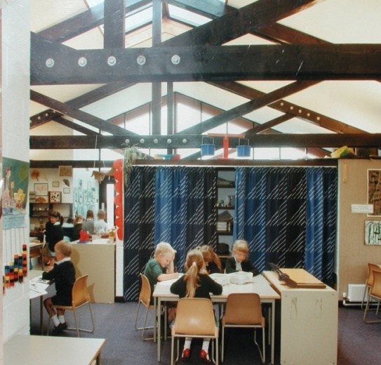 The linear plan form of the building enabled a simple and elegant structural system to be used with exposed, wide span, bolted timber trusses. Uplighters are located within the cords of the trusses to provide a good uniform level of light across the classrooms without cluttering the open vaulted ceilings.