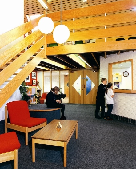 The site for this new primary school enjoys spectacular views over Mersea Island and the Blackwater Estuary.> The steep pitched roofs with their low eaves impart a warm and friendly scale to the primary school and help to integrate the building into the fabric of the village. Roofs are clad in clay pantiles and walls in brickwork with stained weather boarded gables. Roof volumes are expressed internally with high-level ceilings and natural timber boarding for improved acoustics and good air quality.