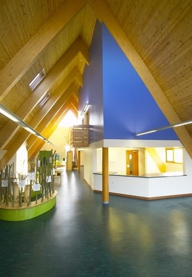 Visitors enter the centre via a fully glazed west-facing porch. An interpretive exhibition occupies most of the ground floor and gives visitors an insight into the original wildwoods of Essex. There are hands-on wood based displays for both children and adults. Sustainable materials have been used throughout and an underfloor heating system, powered by a biomass boiler using locally grown wood-chip, provides heat to the new building as well as the adjacent barns.