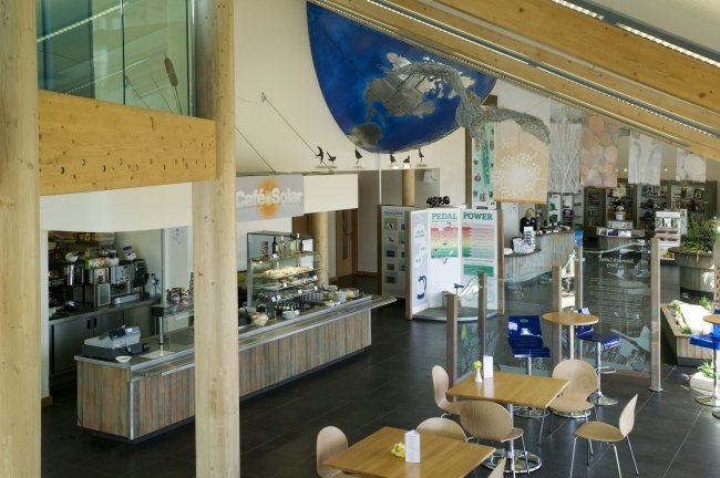 The design and materials used in the construction draw from the key principles of environmental sustainability, with particular emphasis on carbon neutrality. This low energy building is heated using a ground source heat pump and extracts heat from the water in the lake, supported by solar panels and wind turbine.